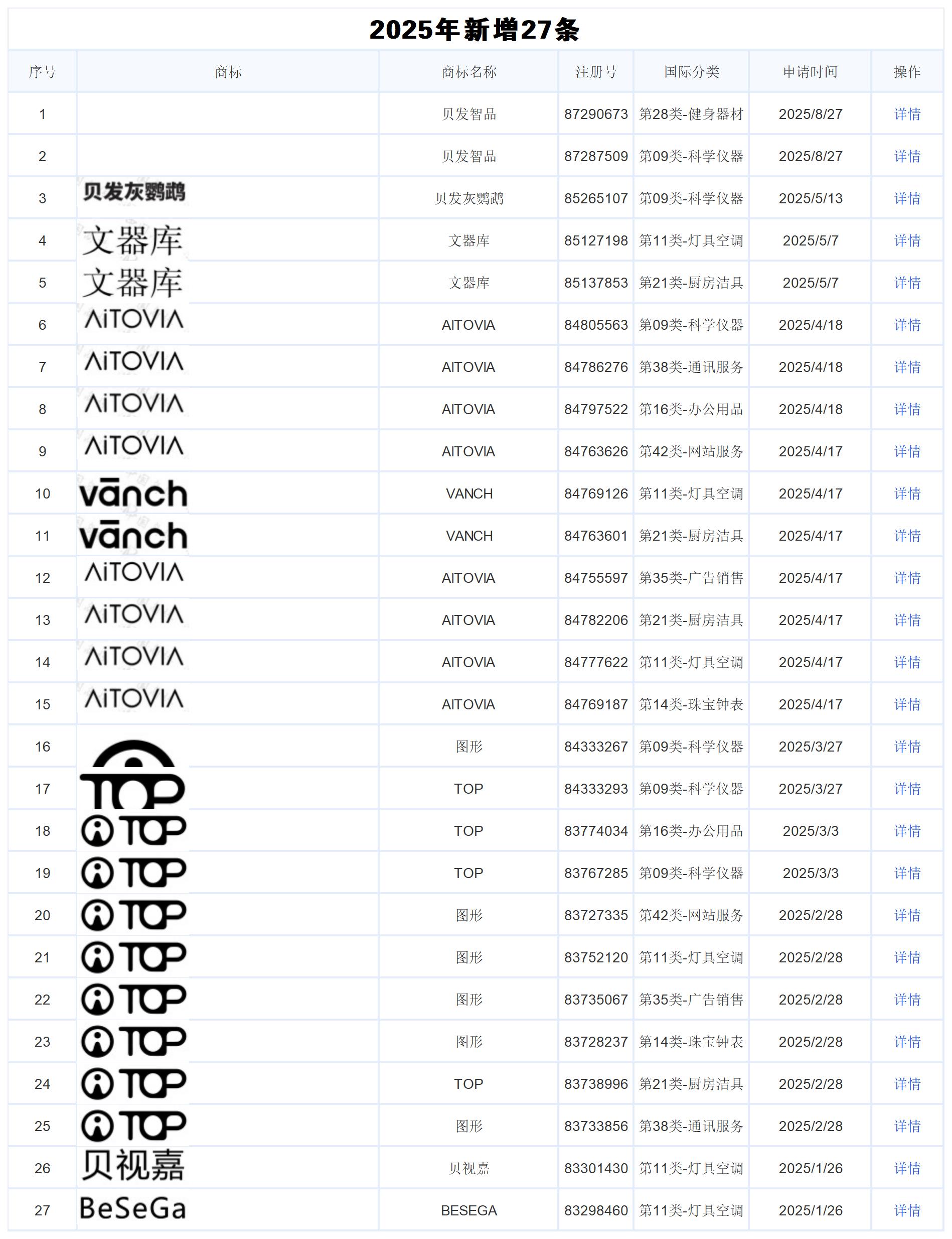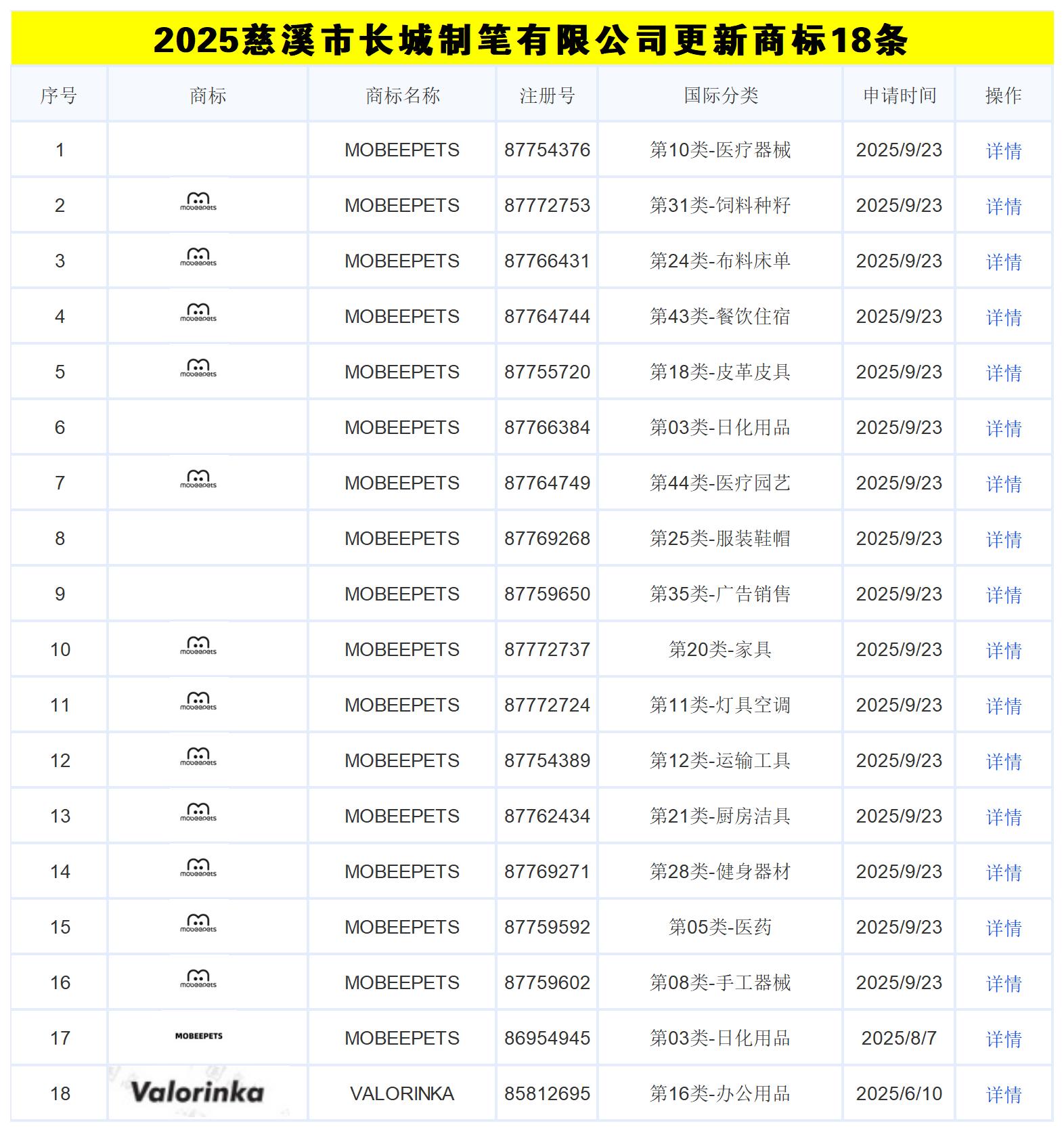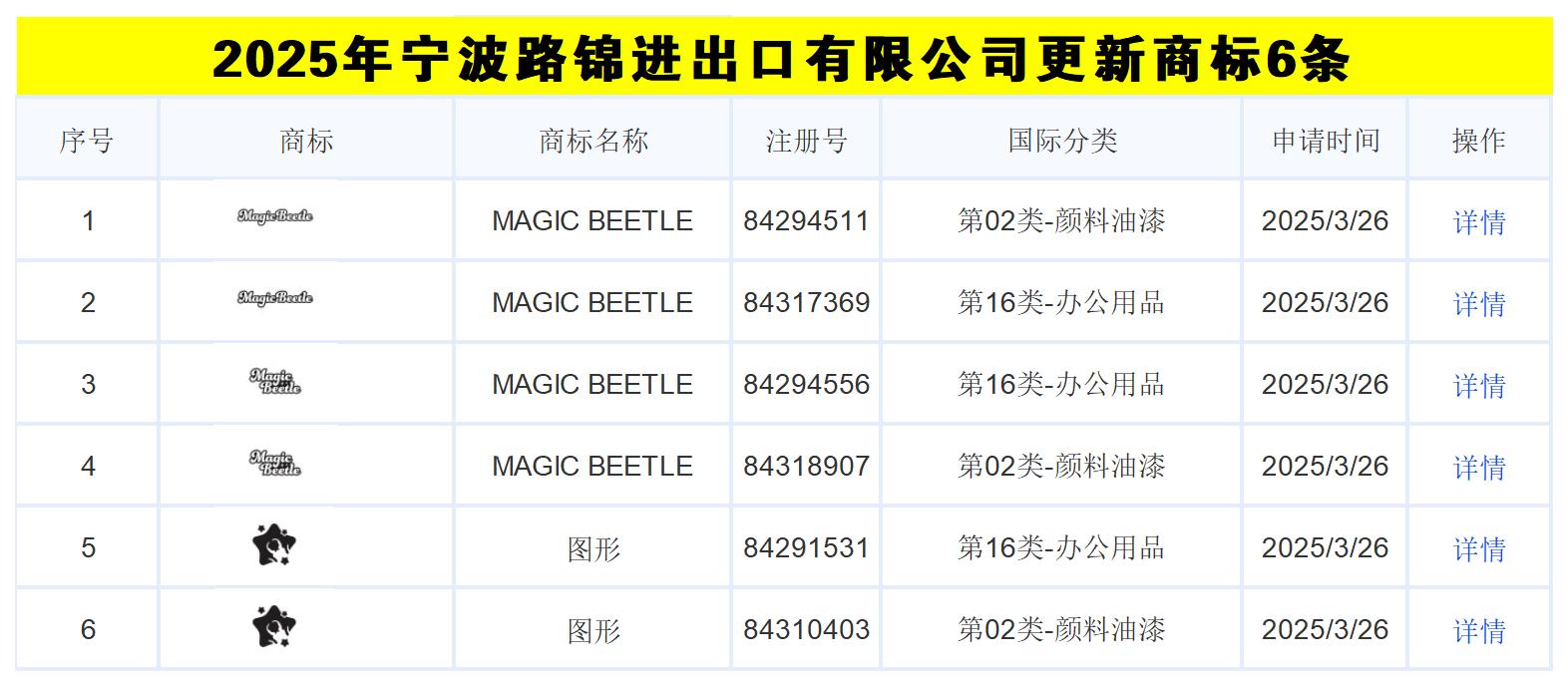 正文:2025年宁波杰丽斯文具有限公司更新商标3条1MMP83497692第16类-办公用品2025 2 17详情2MMP83486379第35类-广告销售2025 2 17详情3MMP83497674第08类-手工器械2025 2 17详情