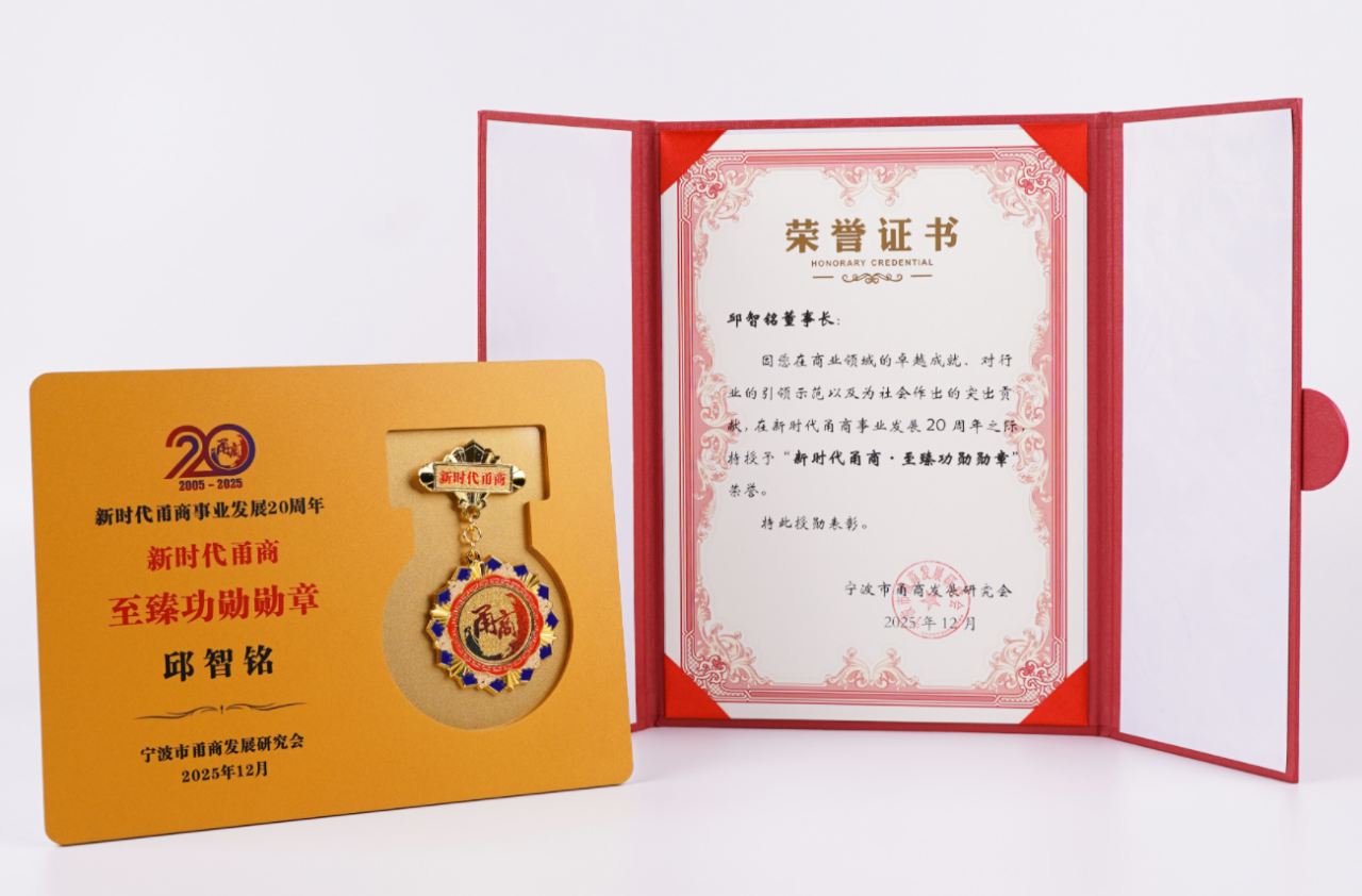 12月7日,“二十而立”2025甬商大会暨新时代甬商事业发展20周年活动在宁波隆重举行。贝发集团董事长邱智铭受邀出席盛会,并凭借在文具行业的深耕引领、对区域经济的突出贡献,荣膺“新时代甬商·至臻功勋勋章”。